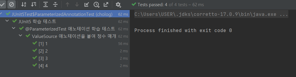 * `Arguments`를 `Stream` 내부에 여러 개 선언해줌으로서, 각 `Arguments`마다 각각의 테스트를 수행하도록 구현할 수 있습니다.