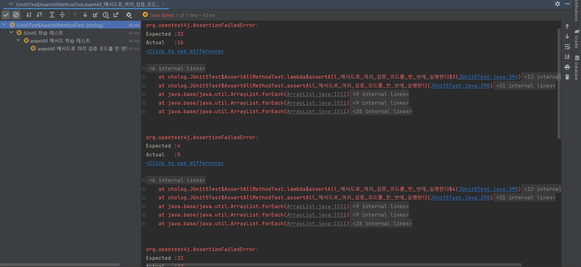 assertAll을 사용해 모든 테스트의 결과를 한 번에 볼 수 있다.