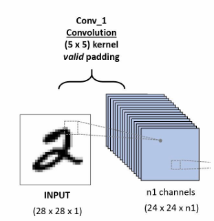 - 28X28X1의 흑백 입력 이미지에 5X5 의 필터를 합성곱