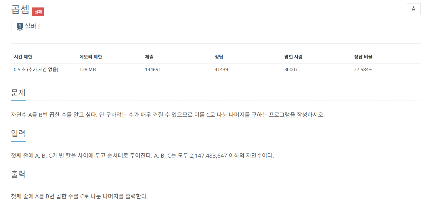 www.acmicpc.net/problem/1629 1629번: 곱셈 첫째 줄에 A, B, C가 빈 칸을 사이에 두고 순서대로 주어진다. A, B, C는 모두 2,147,483,647 이하의 자연수이다. www.acmicpc.net 문제 알고리즘 [접근 방법] 이 문제는 얼핏